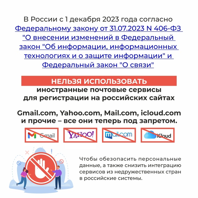 В России с 1 декабря 2023 года согласно Федеральному закону от 31.07.2023 N 406-ФЗ «О внесении изменений в Федеральный закон «Об информации, информационных технологиях и о защите информации» и Федеральный закон «О связи» нельзя использовать иностранные почтовые сервисы для регистрации на российских сайтах. Gmail.com, Yahoo.com, Mail.com, icloud.com и прочие – все они теперь под запретом.